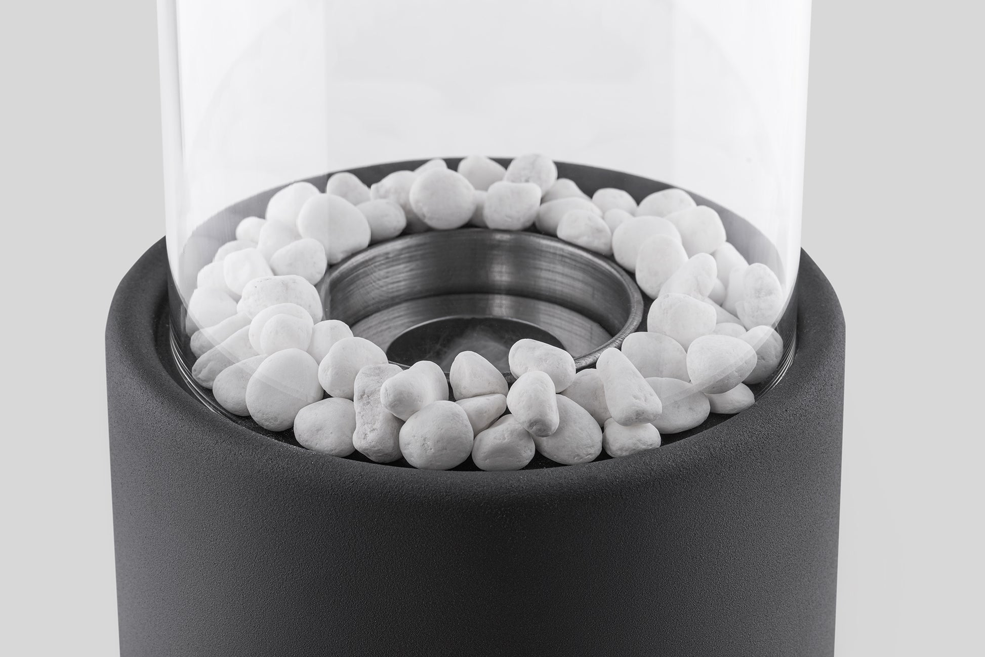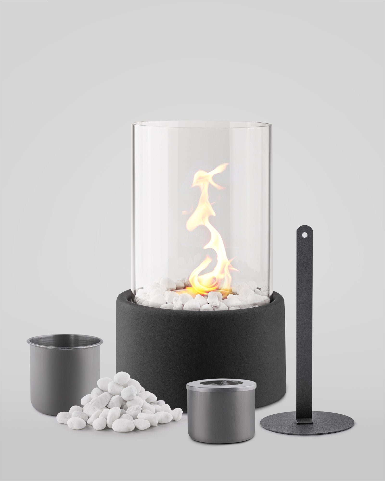 Den elegante cylinderformede bordpejs med klart glas og en sort pulverlakeret fod er nu tilgængelig som en standard pakkeløsning. Dette designelement forener stadig stil og praktisk funktionalitet for at berige din indretning. Den klare glasfront giver fortsat en ubegrænset udsigt til flammerne og tilføjer en følelse af let elegance. Selvom denne pakkeløsning har en mere prisvenlig funktion, fortsætter den med at være et designelement, der vil komplementere dit rum med raffinement og klasse. Mens denne version indeholder færre tilbehør end vores maxi pakkeløsning, skaber den fortsat varme og mindeværdige øjeblikke i dit hjem.